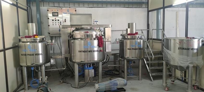 Automatic stainless steel toothpaste manufacturing plant with 200 kg storage capacity. Features up to 500 kg/hr production and standard design type. Made in India.