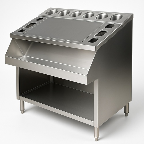 Durable stainless steel bar station, 46"x30"x36", silver, rustproof. Ideal for hotel use with a 100L capacity. Made in India.