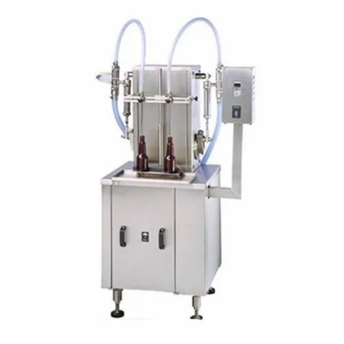 Electric semi-automatic liquid filling machine made of stainless steel for bottle packaging. Designed for efficient and precise filling operations in production lines.