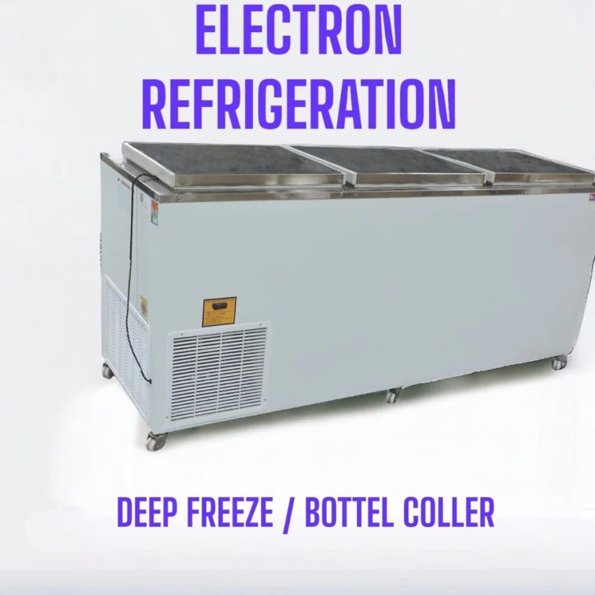 600 L stainless steel deep freezer/bottle cooler. Ideal for ice cream, frozen food, cold drinks, juice, and dairy products. Features 6 wheels and SS body. Dimensions: 82X26X37 inches, 80 KG weight.