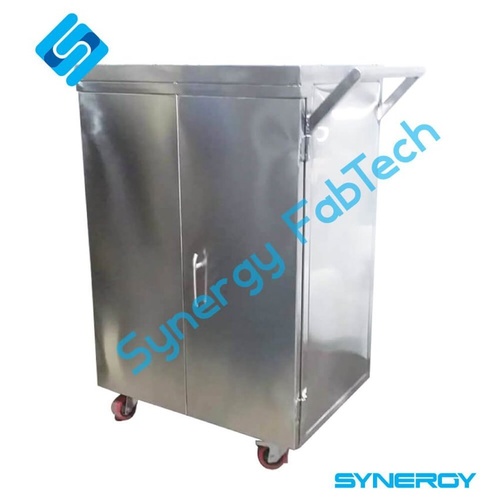 A silver stainless steel cabinet trolley made in India. This durable equipment is designed for practical storage and transport in commercial settings. Available in single piece orders.