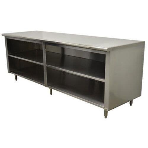 Rectangular stainless steel cabinet work table with polished finish. Features 6 legs for stability and integrated storage. Silver color.