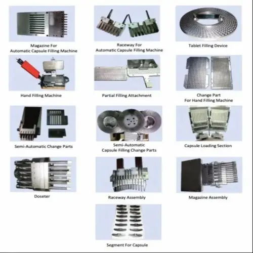Stainless steel change parts engineered for capsule filling machines. Durable construction ensures long-lasting performance in pharmaceutical production environments.