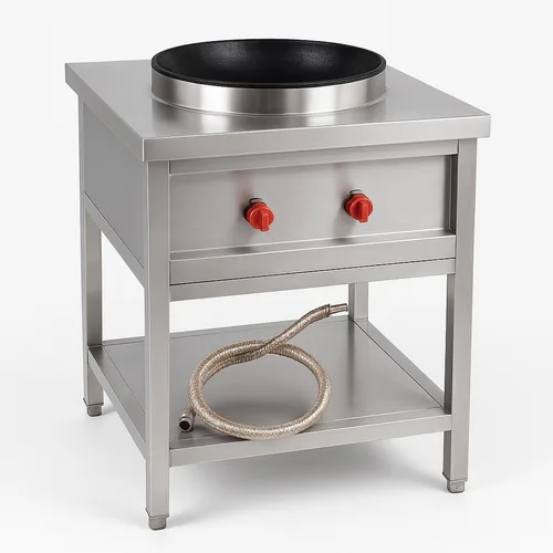 Single Chinese cooking range made of stainless steel. Professional-grade equipment designed for high-heat cooking and durability in commercial kitchens.