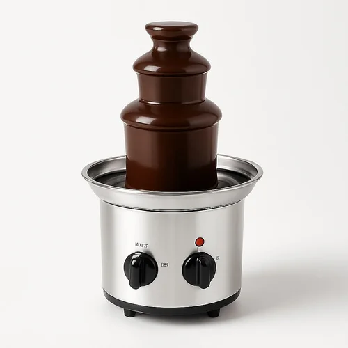 Commercial chocolate fountain machine crafted from stainless steel. Features 180W power, 50 Hz frequency, and 110V-120V voltage. Measures 9(D) x 18(H) Inch with a 1.4 L capacity for events.