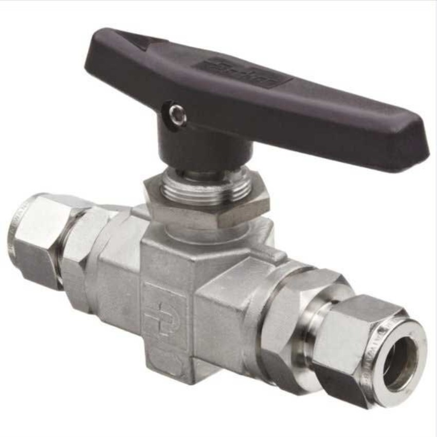 Parker SS 2-way ball valve for industrial gas use. Stainless steel construction, 4000 PSI working pressure, 1/4" OD to 1" OD size, rated for 350°F.