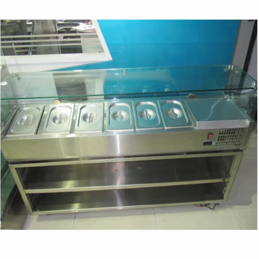 Stainless steel cold salad counter with 1.2 KW power. Designed for commercial food service applications, offering reliable cooling.