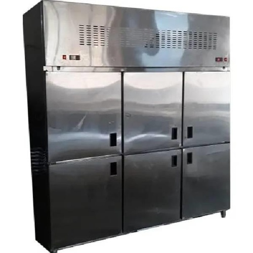 Commercial refrigerator with six doors, 1400-1600L capacity. Features SS-202/SS-304 stainless steel body, up to 6 feet height. Silver finish.