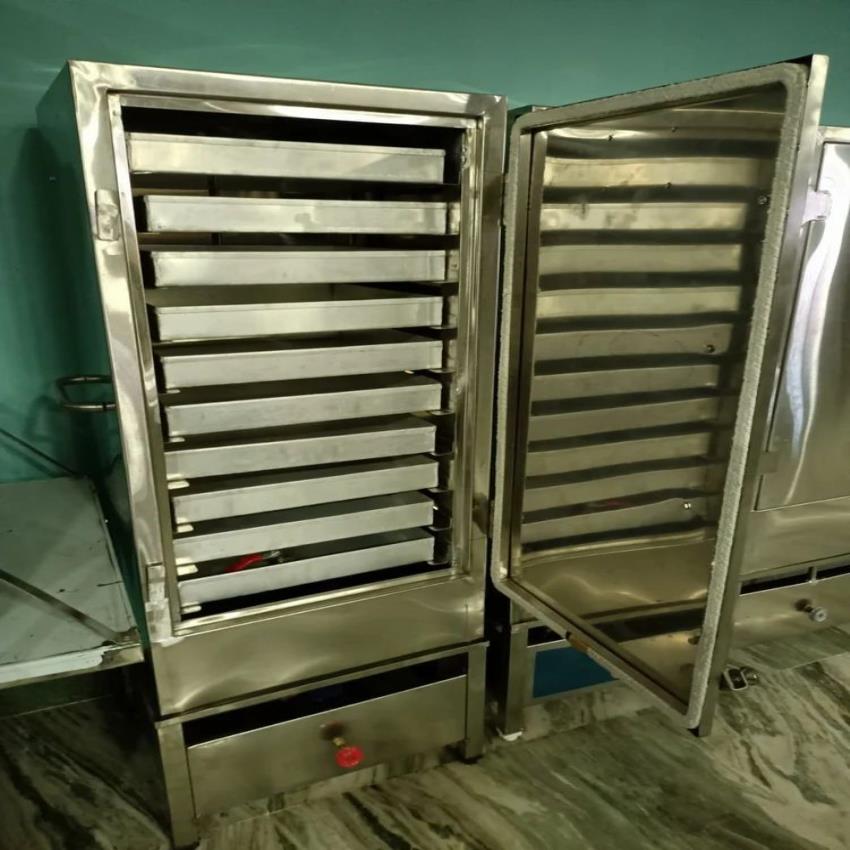 Semi-automatic stainless steel dhokla maker with 8 plates and 30 kg capacity. Designed for preparing khaman, idli, and pattra using gas power.