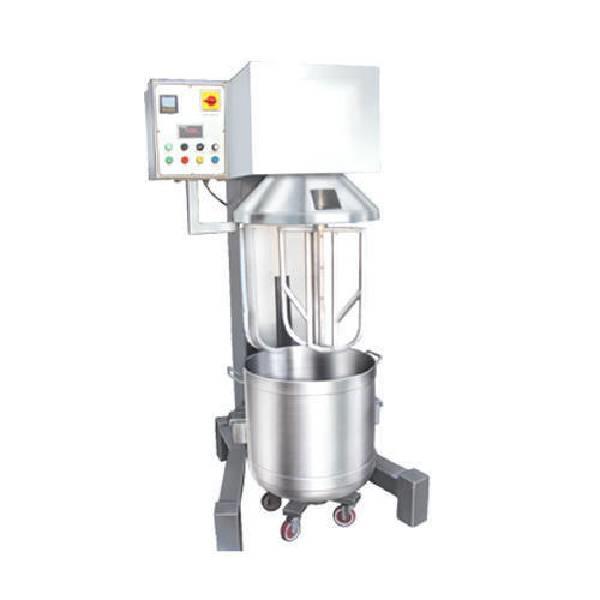 Semi-automatic stainless steel dough mixer for bakery use. Produces 100-200kg/hr with 1500W power. Dimensions: 700x440x660mm. Made in India.