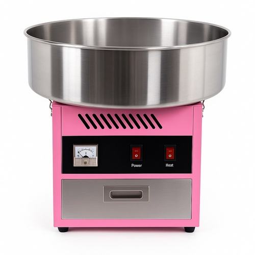 Stainless steel electric candy floss making machine with 1-3 HP electric motor. Operates on 240V, 50Hz. Features semi-automatic operation and 200 gms per cycle capacity.