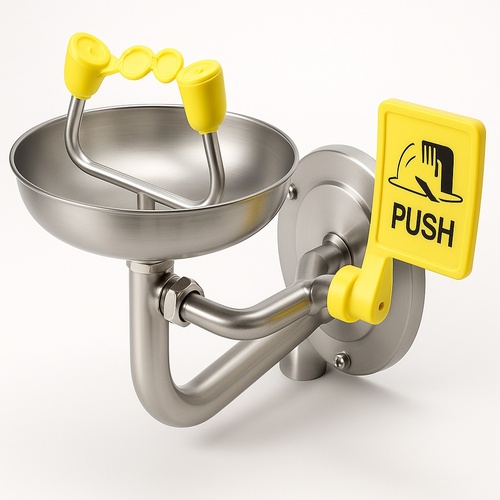 Manual industrial eye wash machine constructed from durable stainless steel. Features a round, silver design, operated by hand for emergency use. Made in India.
