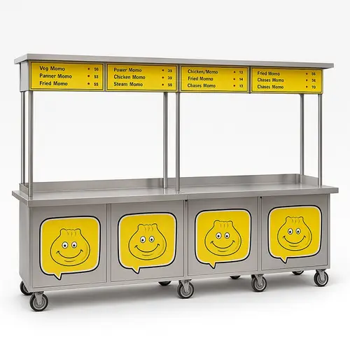 Durable stainless steel food counter designed for serving momos. Features a robust build for commercial food service operations. Simple and functional design for efficient food presentation.