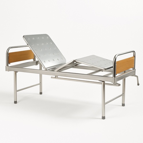 Adjustable manual Fowler bed with a stainless steel frame. Dimensions are 2140mm x 940mm x 500mm. Features white color and is made in India. This is a plain bed type.