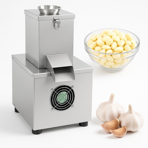 Stainless steel electric garlic peeler machine with 0.5 HP motor. Capacity 10-12kg/h, 18kg weight, compact design suitable for small businesses. No air compressor required.