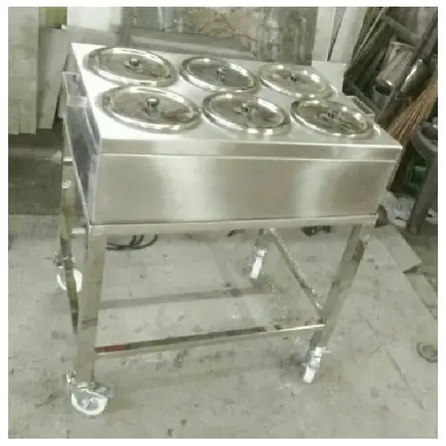 Silver stainless steel hot case for home use. Standard size and shape, featuring durable construction for consistent heating.
