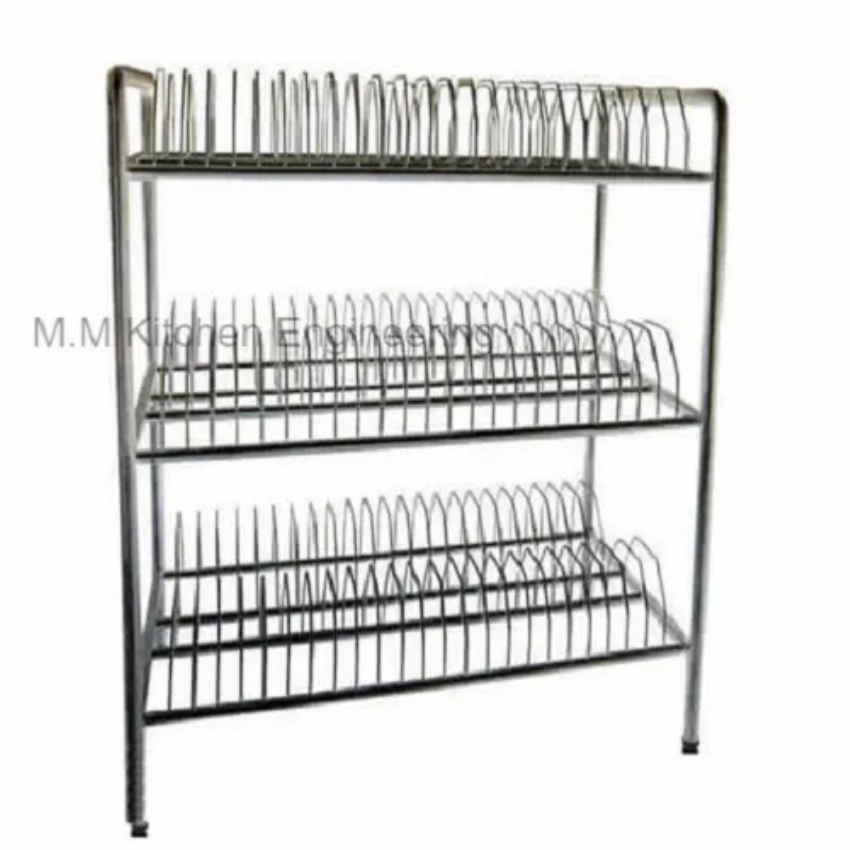 Stainless steel kitchen plate rack for organizing dishes and utensils. Durable construction ensures long-lasting use in busy kitchens.