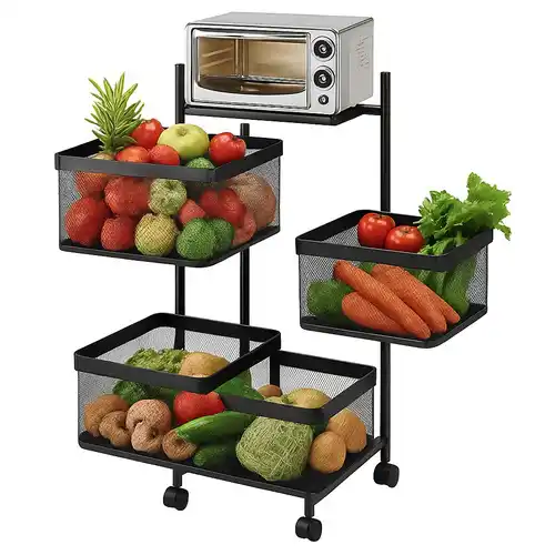 Polished stainless steel kitchen storage rack with 4 shelves. Each layer supports 100kg load. Hot rolled surface treatment ensures durability and longevity.