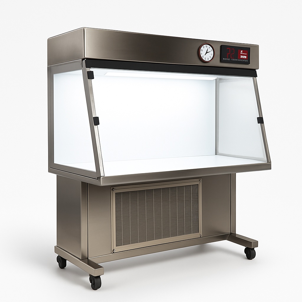 Rectangular stainless steel horizontal laminar airflow machine for laboratory use. Features polished surface finish and 70% efficiency.