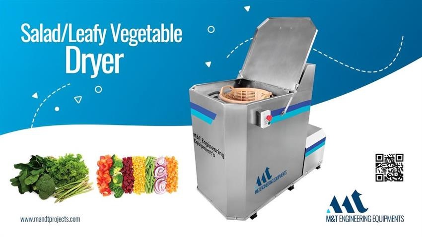 Semi-automatic stainless steel spin dryer for leafy vegetables. Operates on 415V, 0.375KW power. Standard design, new condition.