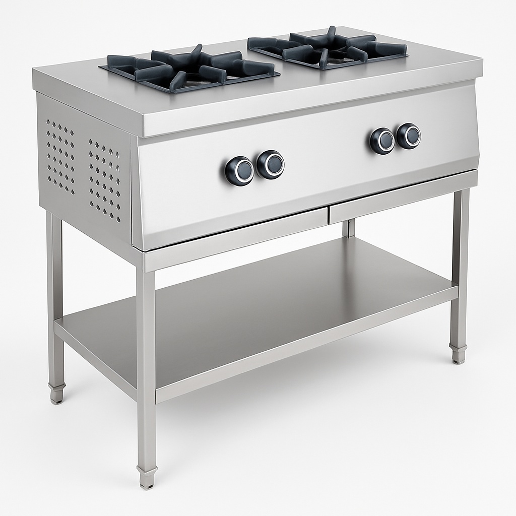 Stainless steel two-burner LPG range specifically designed for hotel applications. Ensures reliable cooking performance with durable construction.