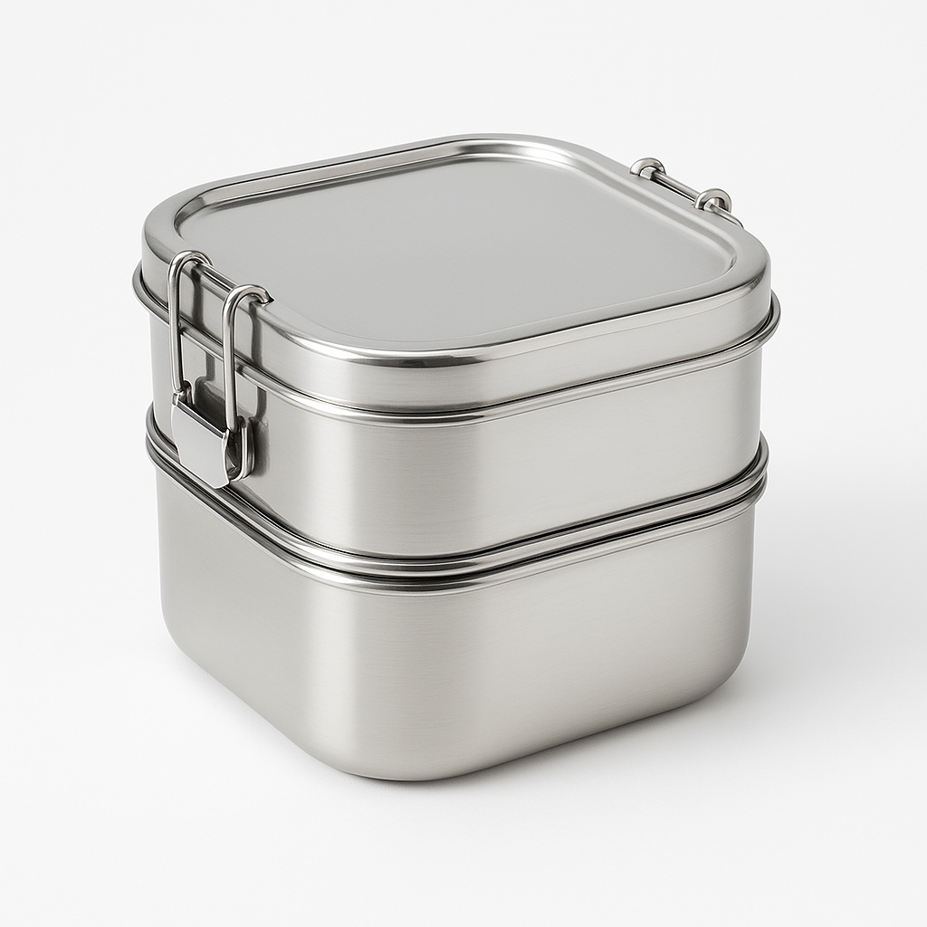 Grey stainless steel lunch box for kitchen use. Features a 2.5 x 8 size, durable construction, and easy-to-clean surface. Ideal for everyday meals.