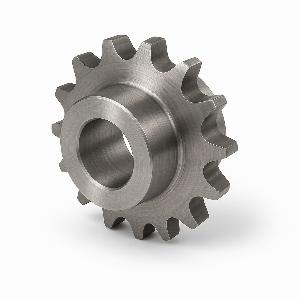 Machined stainless steel JCB chain sprocket for heavy-duty machines. Simplex, 23 teeth, 19.1mm bore, 19.05mm pitch. Type A hub, hardened teeth.
