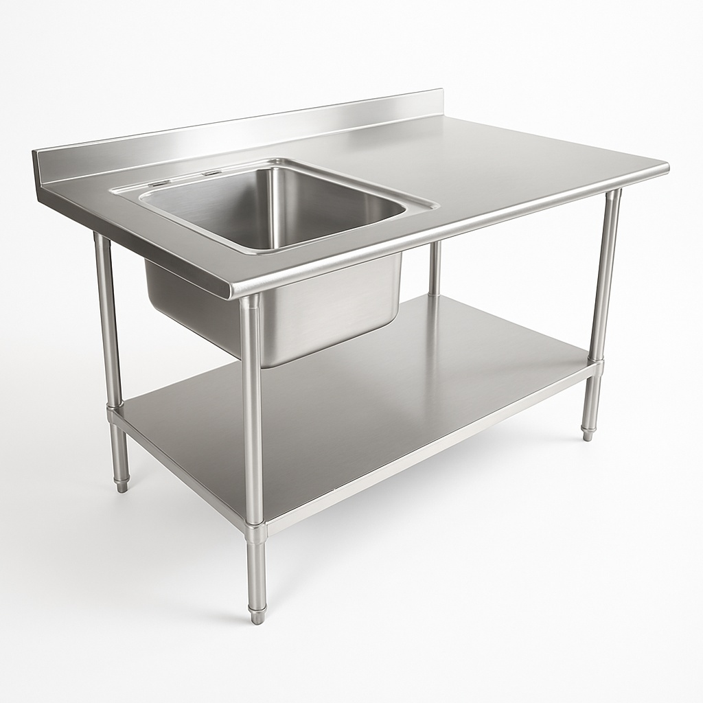Meat Cutting Table, Stainless Steel, Made in India. Up to 2-inch thickness, 2m length. Durable and hygienic for meat processing.