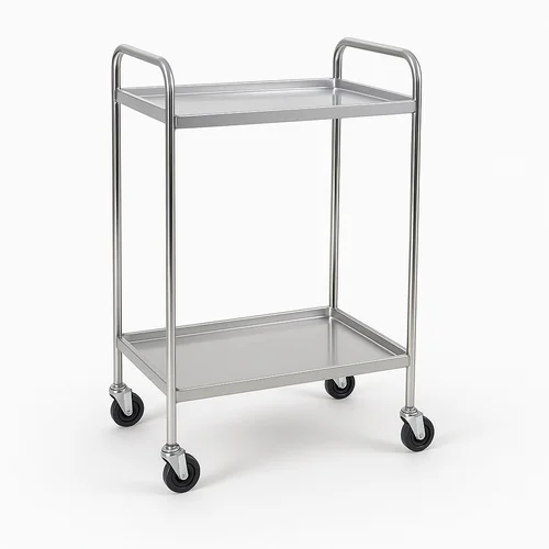 Two-shelf stainless steel hospital trolley, 2x3 feet. Corrosion-resistant, polished finish, with four wheels for easy maneuverability in healthcare settings.