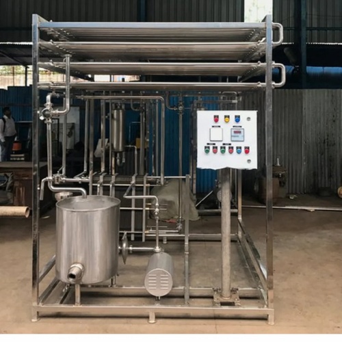 Automatic stainless steel milk pasteuriser unit with a capacity of up to 100 LPH. Operates on 440 V, three-phase electric power for efficient milk processing.