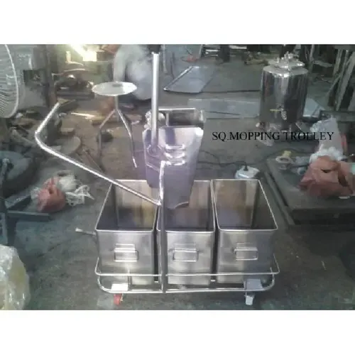 Industrial stainless steel mopping trolley, SS 304/SS 202 grade. Features a matte finish and accommodates 10-25 L buckets. Designed for industrial applications.