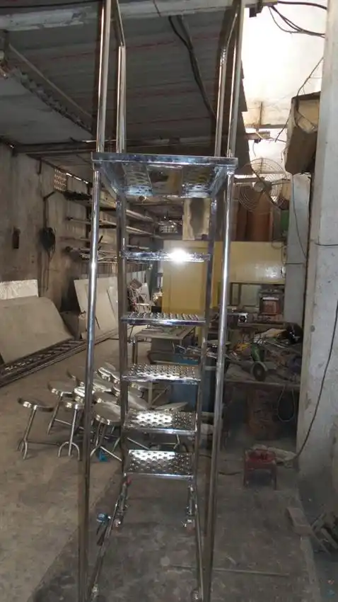 Corrosion-resistant stainless steel movable ladder with 6 steps. Ideal for medical stores and automobile industries. 1-year warranty.