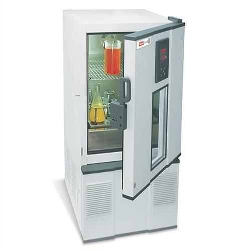 A stainless steel orbital shaking incubator operating between +5°C and 60°C. Features a voltage range of 220-380V and includes a door lock.