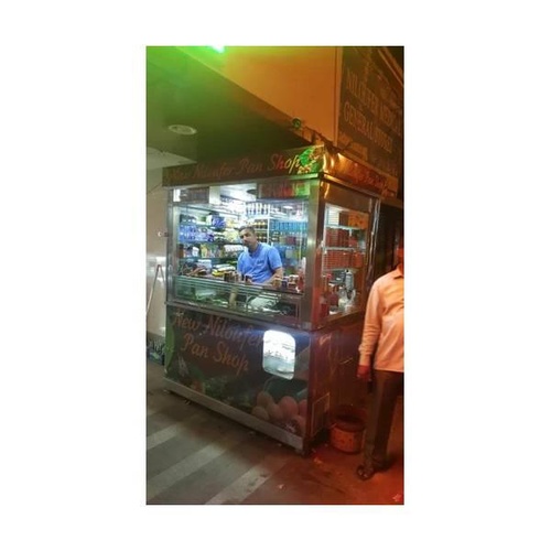 Durable stainless steel pan shop display counter. Built for professional use, offering ample space for product presentation and storage. Ideal for commercial establishments.