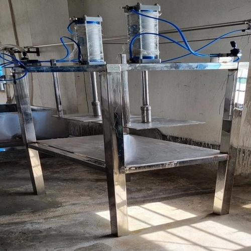Semi-automatic press machine, SS304 body, 5 ft height. Numeric control power source, 50 Kg product capacity. Ideal for efficient paneer production.