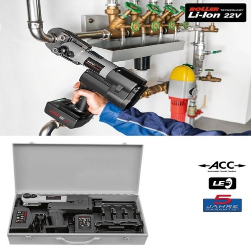 Stainless steel pipe crimping machine for industrial use. Medium pressure capacity. Lightweight design, 3.2 kg with battery.