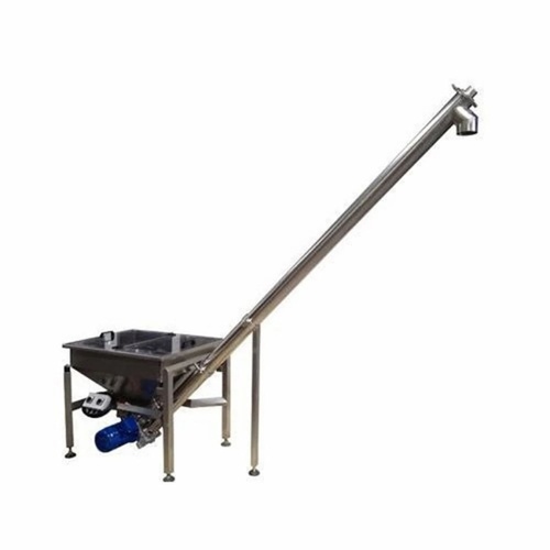 Semi-automatic pipe screw conveyor for industrial use. Constructed from stainless steel and mild steel, with a capacity of 100-800 kg and 440 V operation.