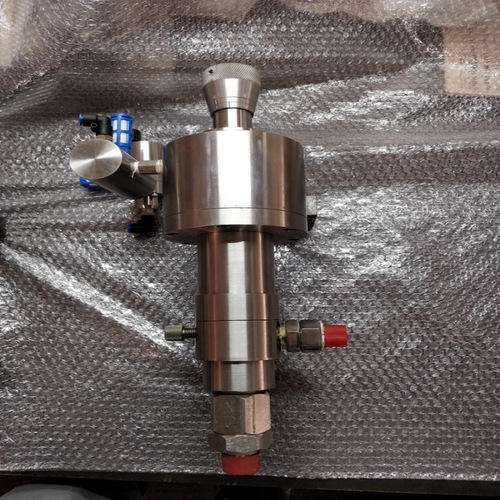 Plunger type pneumatic driven dosing machine. Stainless steel construction with SS suction/discharge tubing. Achieves 150 BAR head, 0-80 LPH flow rate. Features mirror surface finish for chemical dosing in oil industries.