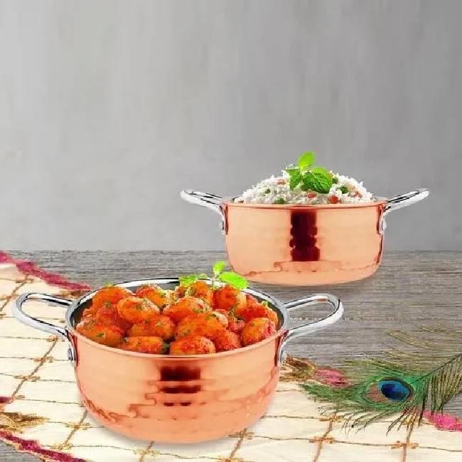 Stainless steel Punjabi Handi, golden color. 300 ml capacity, 13-inch diameter. Made in India. Suitable for kitchenware and serving.