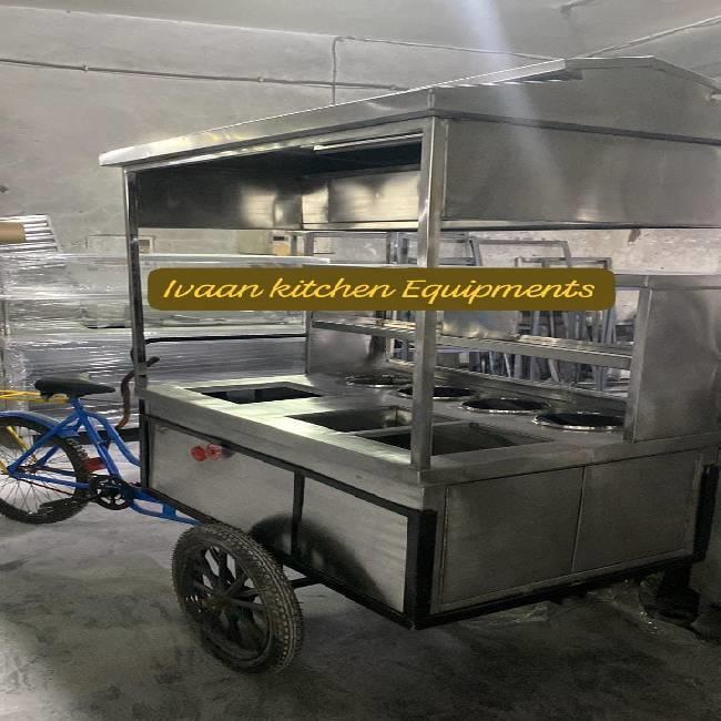 Stainless steel fast food push cart with 4 wheels. Supports 150 kg load capacity and measures 3x2. Suitable for fast food operations.