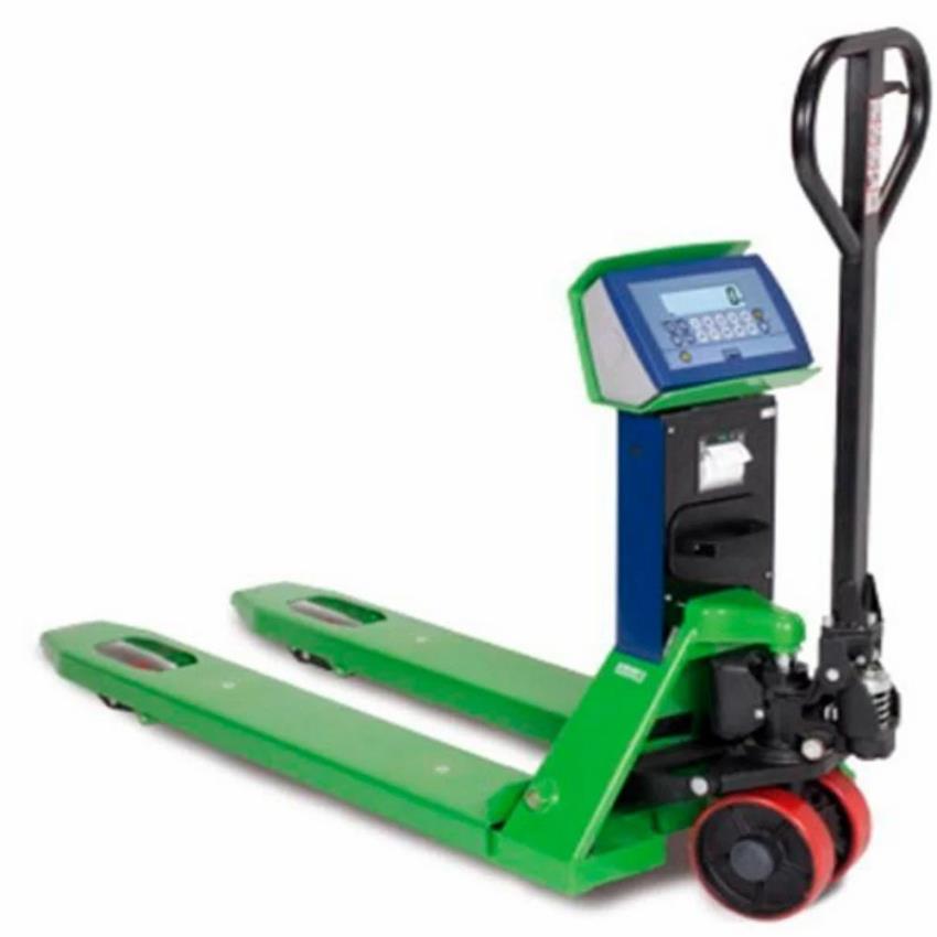 Stainless steel pallet scale device with load capacities of 1-3 ton to 5-7 ton. Available fork lengths up to 2300 mm and max lifting heights of 400 mm.