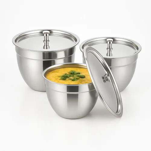 Three-piece round stainless steel serving bowl set. Medium size, silver color, ideal for home usage. Minimum order quantity of 24 sets.