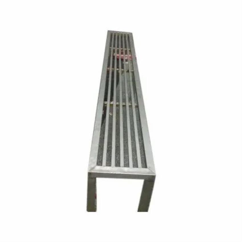 Five-foot long stainless steel slat bench, 1.5ft height, rectangular shape with four legs. Designed for general seating applications.