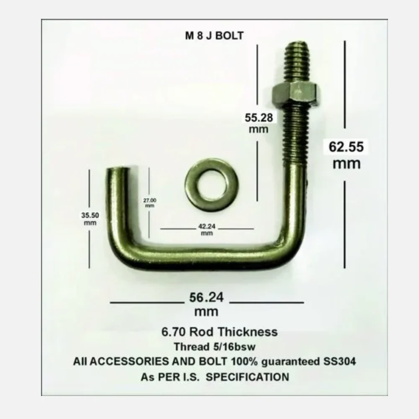 Silver stainless steel J hook, 40x40mm size, ideal for solar installations. Weighs 0.3kg and is manufactured in India. Available in stock.