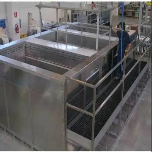 Stainless steel spray phosphating machine with 1500 L input and 1000 L output capacity. Powered by electric 37 kW. Efficient for industrial finishing.