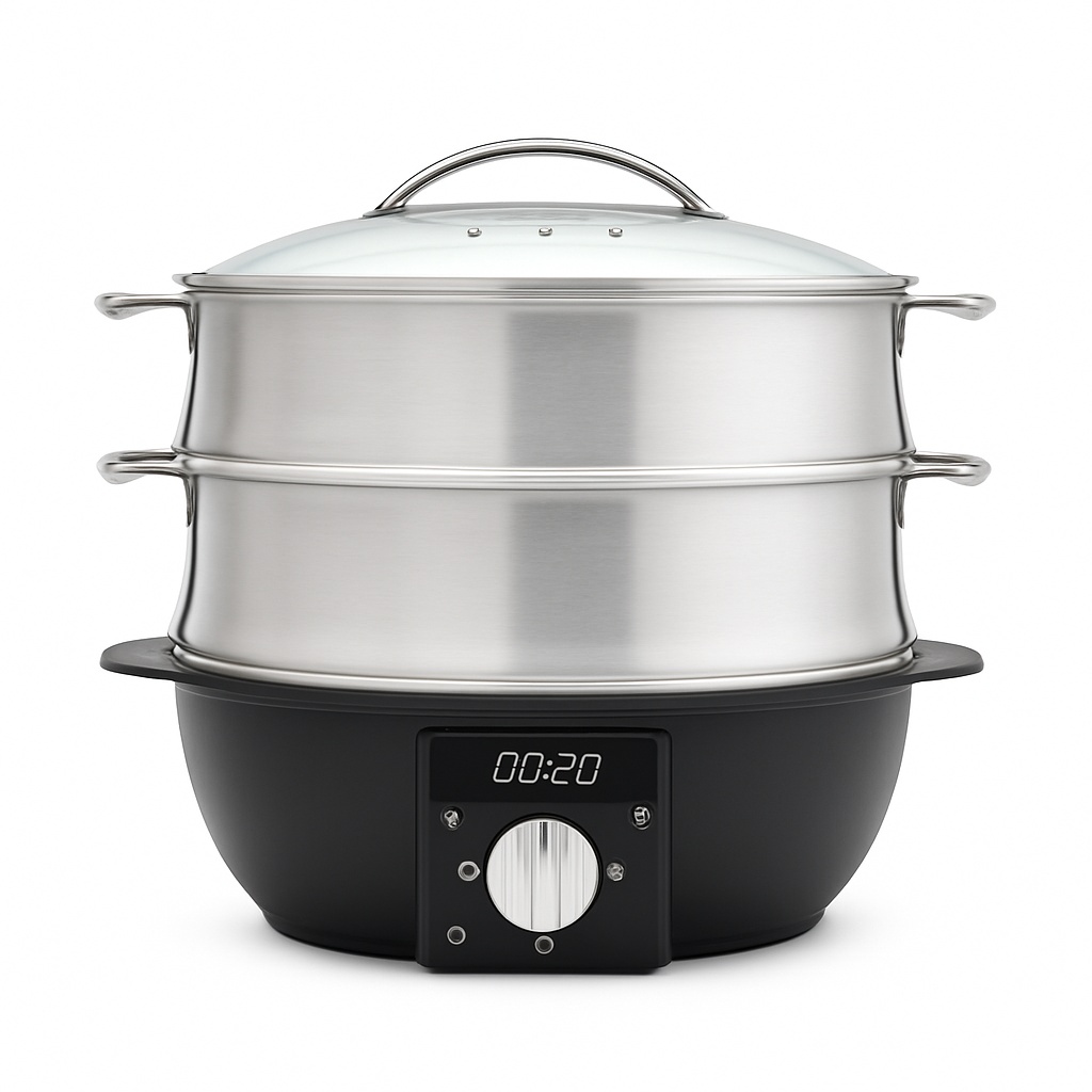 Durable stainless steel steam cooker designed for efficient cooking. Compact and reliable for kitchen use.