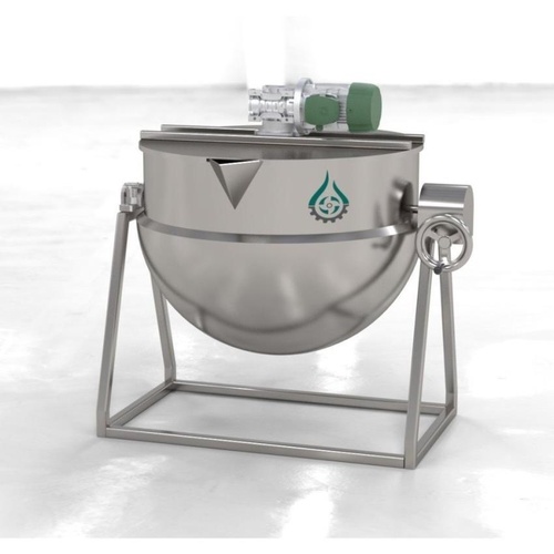 Industrial stainless steel steam jacketed kettle with 600 LPH capacity. Features a Teflon scraper and fixed tilting arrangement. Ideal for industrial applications.