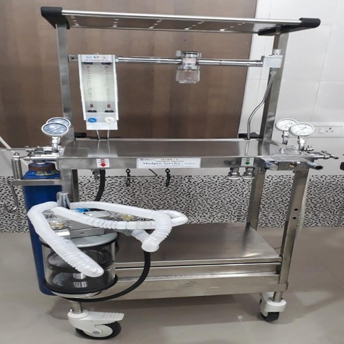 Trolley-mounted stainless steel anaesthesia machine for operation use. Manual automation grade. Model Medvu v.