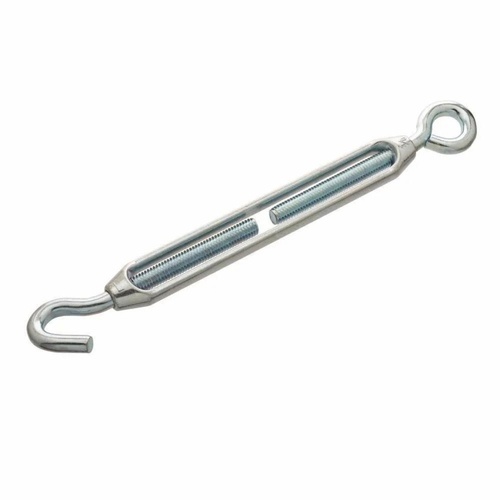 Industrial stainless steel turnbuckle with zinc-plated finish. 5/16 in length, 9-3/8 in width. Galvanized surface treatment for enhanced durability.