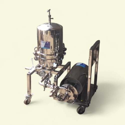 Automatic S.S. 304/316L filtration machine for industries and pharmaceuticals. Capacity 20-2000 liters with cylinder type filters. Customized design, vertical frame, 40-50 plates.